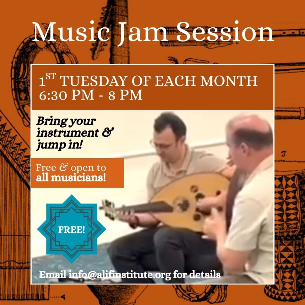 Calling all musicians who play Arabic music! Come to Alif Institute on the 1st Tuesday of each month from 6:30 pm – 8 pm to meet other musicians and jam.